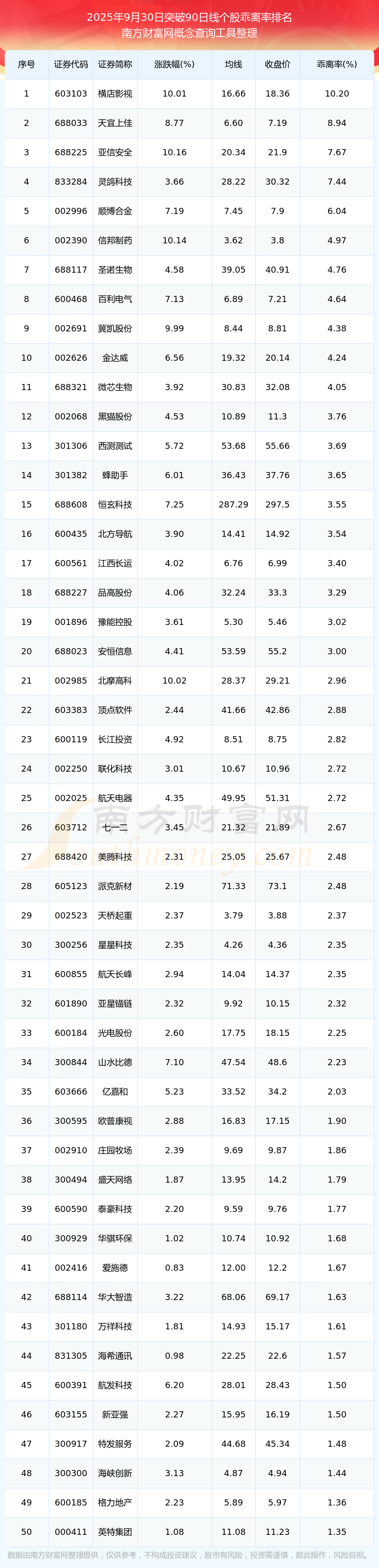 2025年9月30日突破90日線個(gè)股乖離率排名
