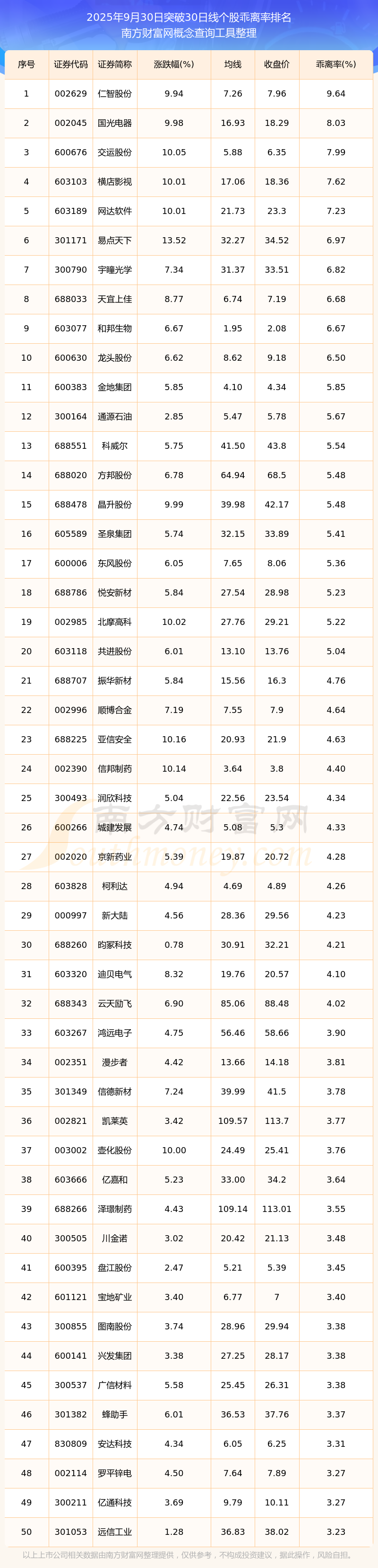 根據(jù)南方財富網(wǎng)概念查詢工具數(shù)據(jù)統(tǒng)計,截止2025年9月30日收盤,共有317只個股收盤價向上突破了30日線,其中乖離率較大的個股有仁智股份、國光電器、交運股份、橫店影視、網(wǎng)達(dá)軟件等,乖離率分別為9.64%、8.03%、7.99%、7.62%、7.23%。