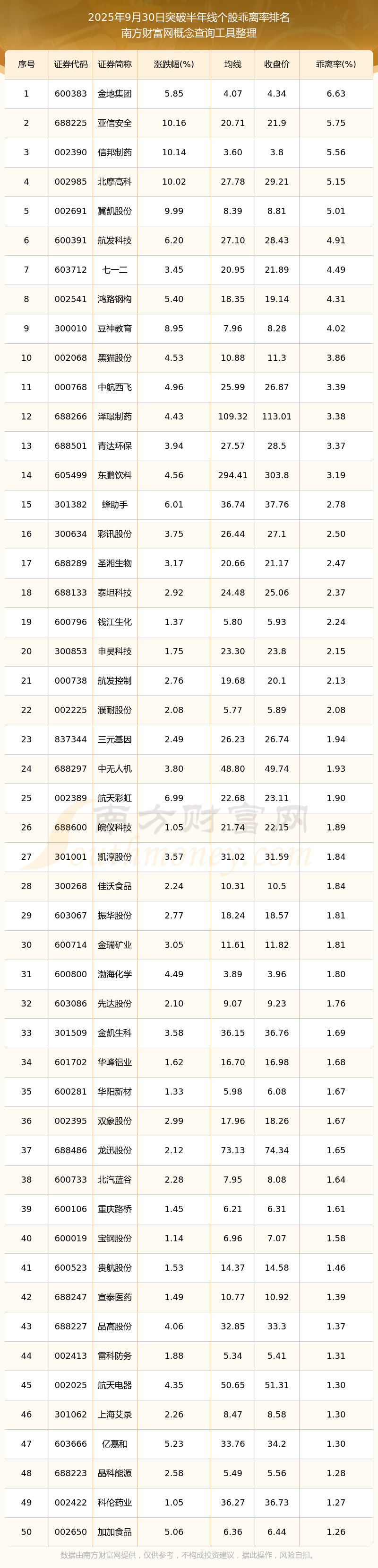 根據(jù)南方財(cái)富網(wǎng)概念查詢工具數(shù)據(jù)統(tǒng)計(jì),截止2025年9月30日收盤,共有119只個股收盤價(jià)向上突破了120日線,其中乖離率較大的個股有金地集團(tuán)、亞信安全、信邦制藥、北摩高科、冀凱股份等,乖離率分別為6.63%、5.75%、5.56%、5.15%、5.01%。
