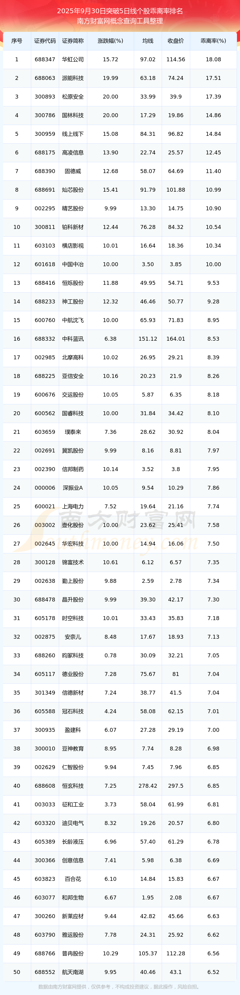 根據(jù)南方財富網(wǎng)概念查詢工具數(shù)據(jù)統(tǒng)計,截止2025年9月30日收盤,共有1271只個股收盤價向上突破了5日線,其中乖離率較大的個股有華虹公司、派能科技、松原安全、國林科技、線上線下等,乖離率分別為18.08%、17.51%、17.39%、14.86%、14.84%。
