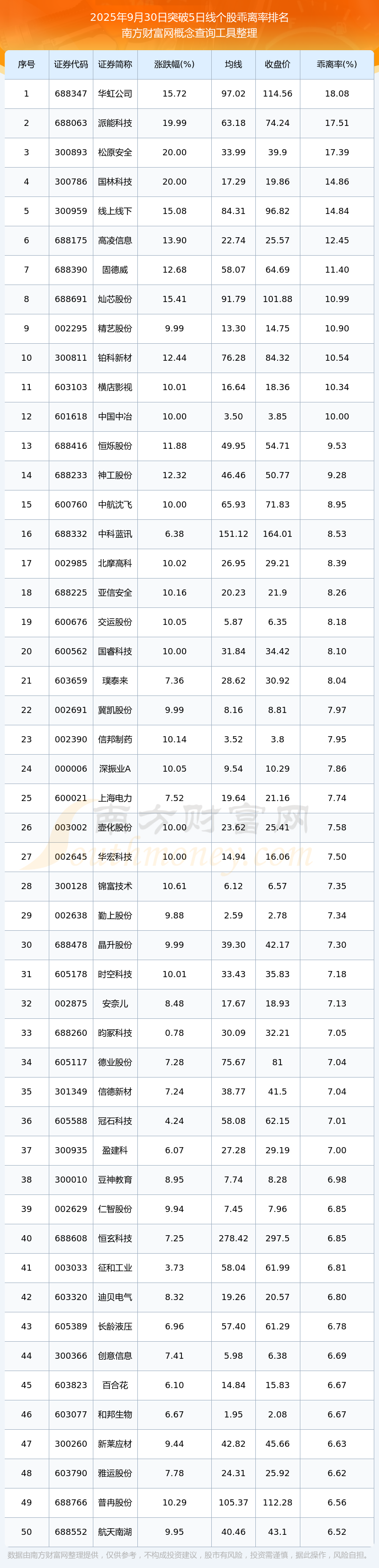 根據(jù)南方財富網(wǎng)概念查詢工具數(shù)據(jù)統(tǒng)計,截止2025年9月30日收盤,共有1271只個股收盤價向上突破了5日線,其中乖離率較大的個股有華虹公司、派能科技、松原安全、國林科技、線上線下等,乖離率分別為18.08%、17.51%、17.39%、14.86%、14.84%。 2025年9月30日突