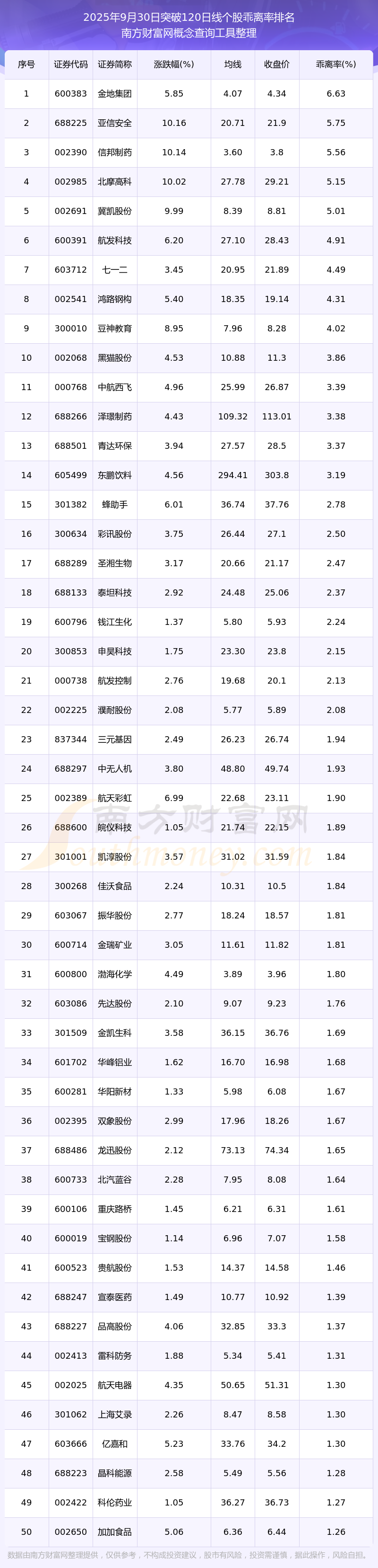 根據(jù)南方財富網(wǎng)概念查詢工具數(shù)據(jù)統(tǒng)計,截止2025年9月30日收盤,共有119只個股收盤價向上突破了120日線,其中乖離率較大的個股有金地集團、亞信安全、信邦制藥、北摩高科、冀凱股份等,乖離率分別為6.63%、5.75%、5.56%、5.15%、5.01%。