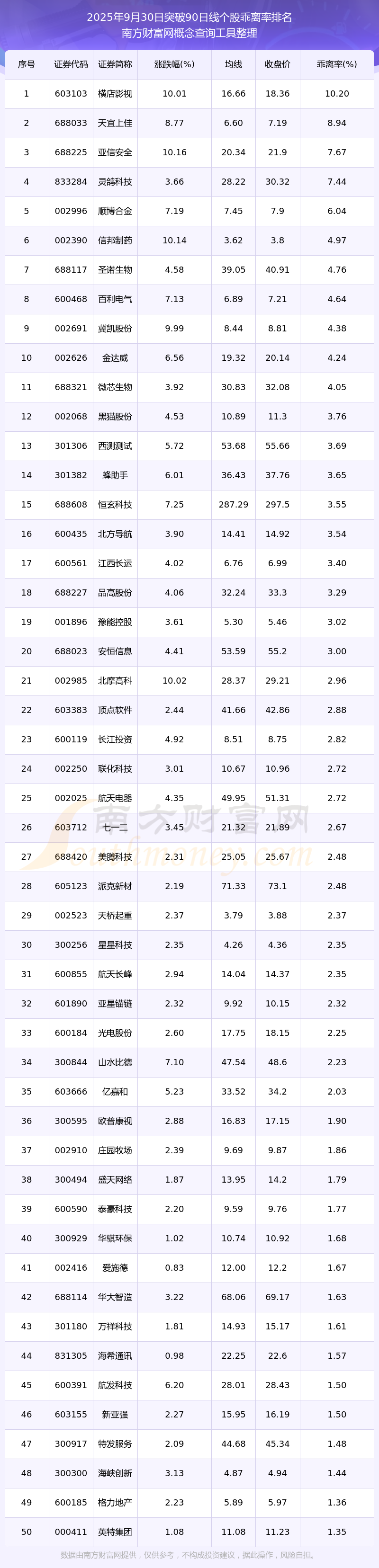 2025年9月30日突破90日線個(gè)股乖離率排名