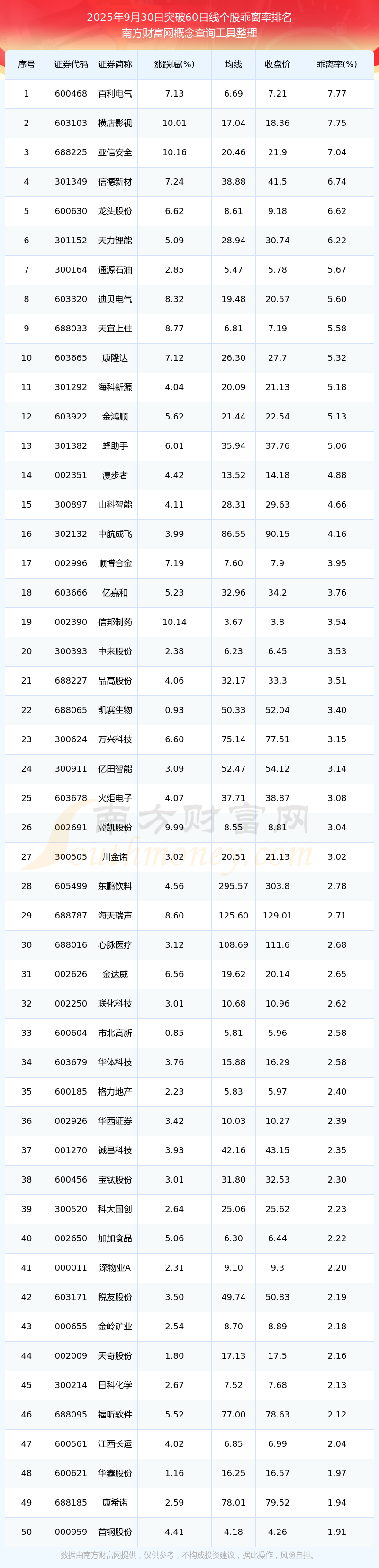 根據(jù)南方財富網(wǎng)概念查詢工具數(shù)據(jù)統(tǒng)計,截止2025年9月30日收盤,共有160只個股收盤價向上突破了60日線,其中乖離率較大的個股有百利電氣、橫店影視、亞信安全、信德新材、龍頭股份等,乖離率分別為7.77%、7.75%、7.04%、6.74%、6.62%。