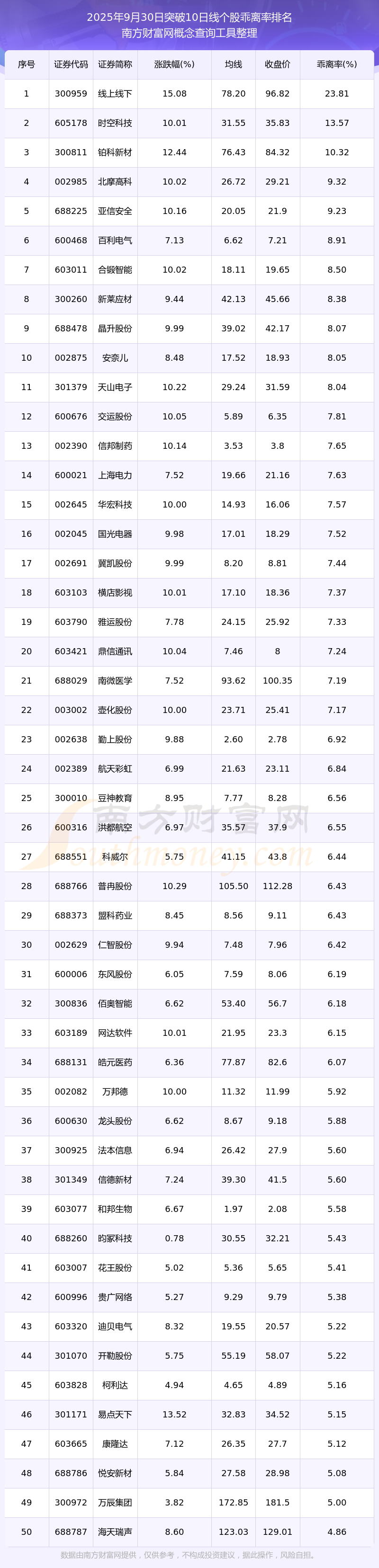 根據(jù)南方財富網(wǎng)概念查詢工具數(shù)據(jù)統(tǒng)計,截止2025年9月30日收盤,共有716只個股收盤價向上突破了10日線,其中乖離率較大的個股有線上線下、時空科技、鉑科新材、北摩高科、亞信安全等,乖離率分別為23.81%、13.57%、10.32%、9.32%、9.23%。