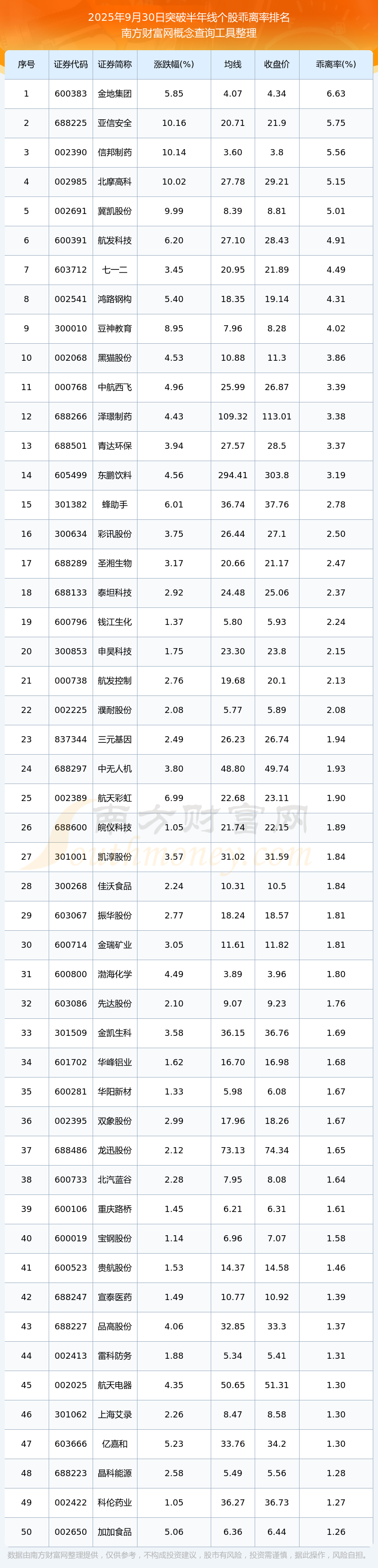 根據(jù)南方財富網(wǎng)概念查詢工具數(shù)據(jù)統(tǒng)計,截止2025年9月30日收盤,共有119只個股收盤價向上突破了半年線,其中乖離率較大的個股有金地集團、亞信安全、信邦制藥、北摩高科、冀凱股份等,乖離率分別為6.63%、5.75%、5.56%、5.15%、5.01%。
