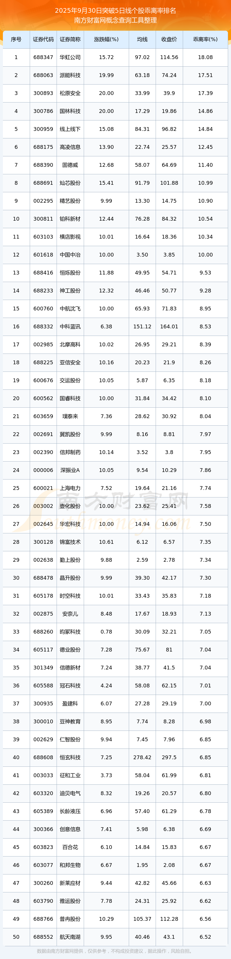 2025年9月30日突破5日線個(gè)股乖離率排名