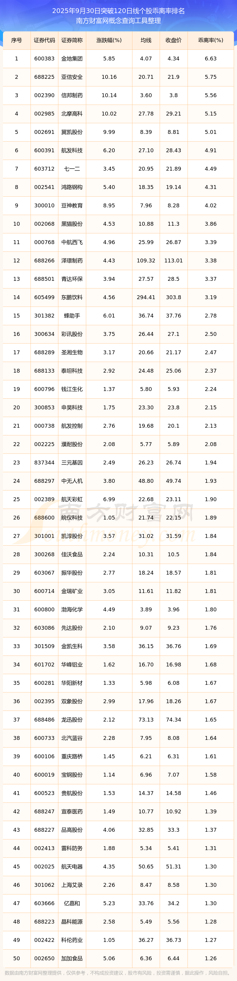 根據南方財富網概念查詢工具數據統計,截止2025年9月30日收盤,共有119只個股收盤價向上突破了半年線,其中乖離率較大的個股有金地集團、亞信安全、信邦制藥、北摩高科、冀凱股份等,乖離率分別為6.63%、5.75%、5.56%、5.15%、5.01%。