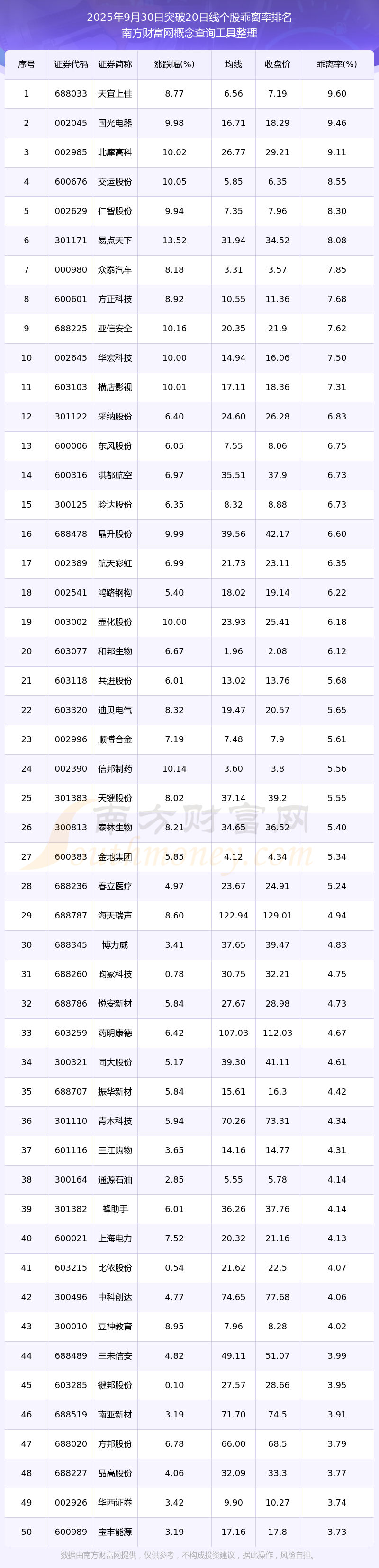 2025年9月30日突破20日線個股乖離率排名