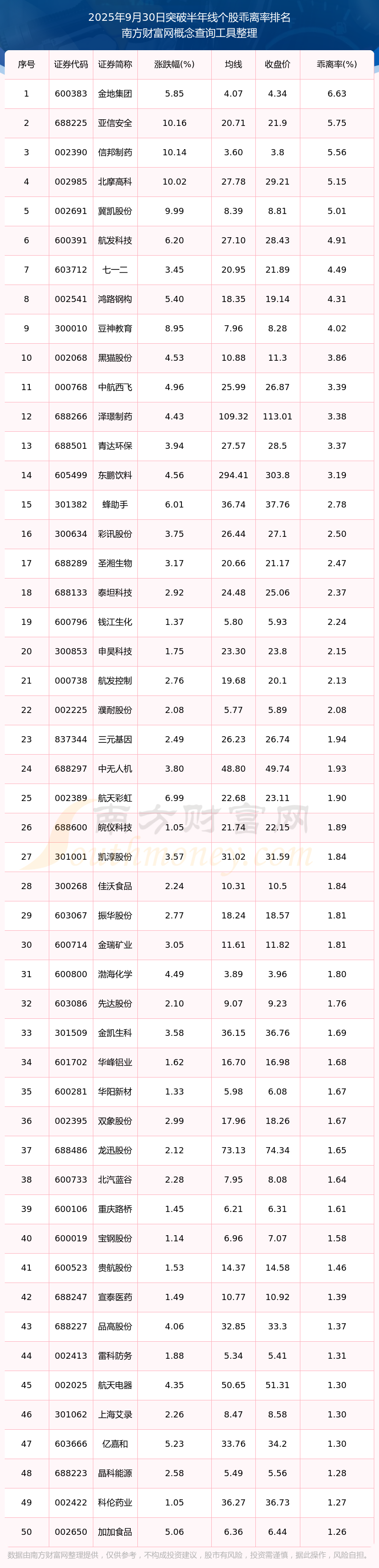 根據(jù)南方財富網(wǎng)概念查詢工具數(shù)據(jù)統(tǒng)計,截止2025年9月30日收盤,共有119只個股收盤價向上突破了半年線,其中乖離率較大的個股有金地集團、亞信安全、信邦制藥、北摩高科、冀凱股份等,乖離率分別為6.63%、5.75%、5.56%、5.15%、5.01%。