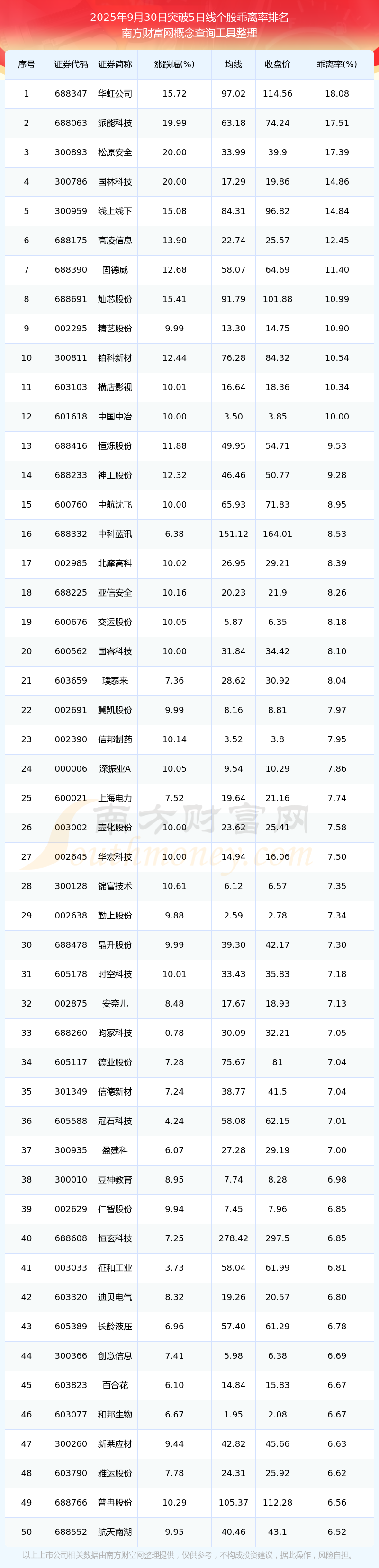 2025年9月30日突破5日線個(gè)股乖離率排名