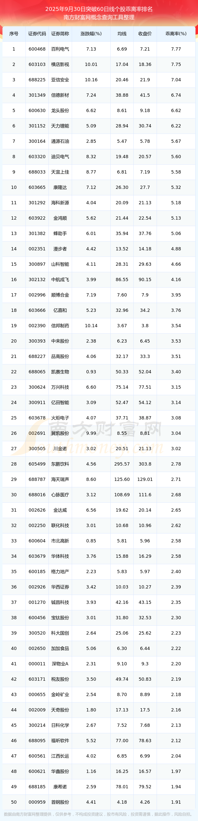 2025年9月30日突破60日線個(gè)股乖離率排名