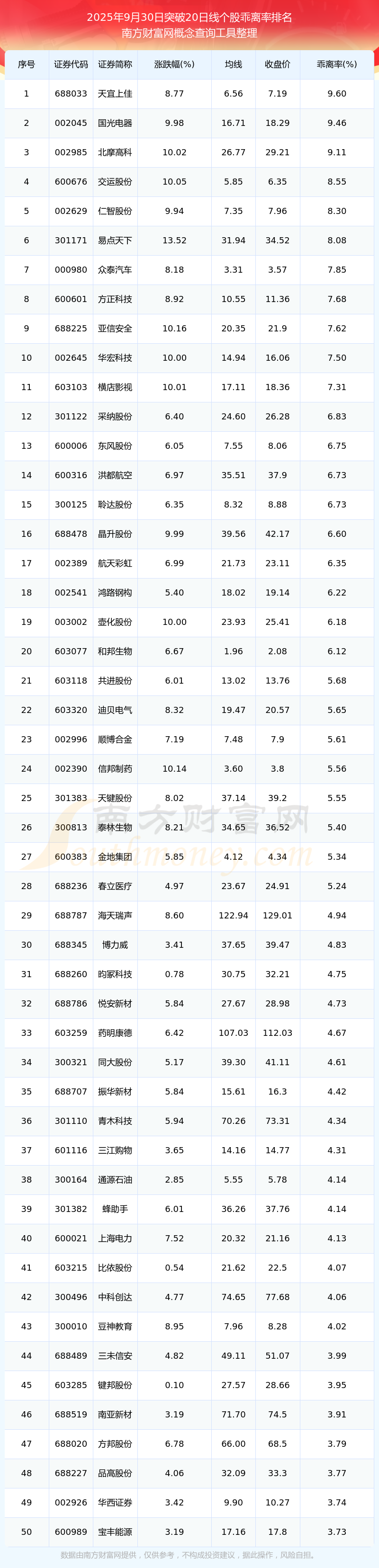 根據(jù)南方財富網(wǎng)概念查詢工具數(shù)據(jù)統(tǒng)計,截止2025年9月30日收盤,共有436只個股收盤價向上突破了20日線,其中乖離率較大的個股有天宜上佳、國光電器、北摩高科、交運股份、仁智股份等,乖離率分別為9.60%、9.46%、9.11%、8.55%、8.30%。