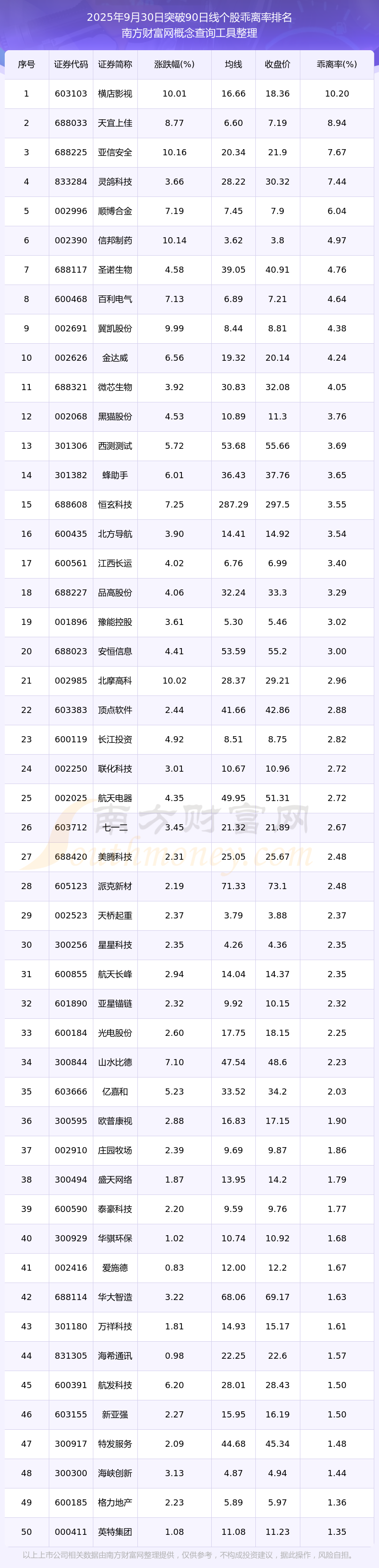 2025年9月30日突破90日線(xiàn)個(gè)股乖離率排名