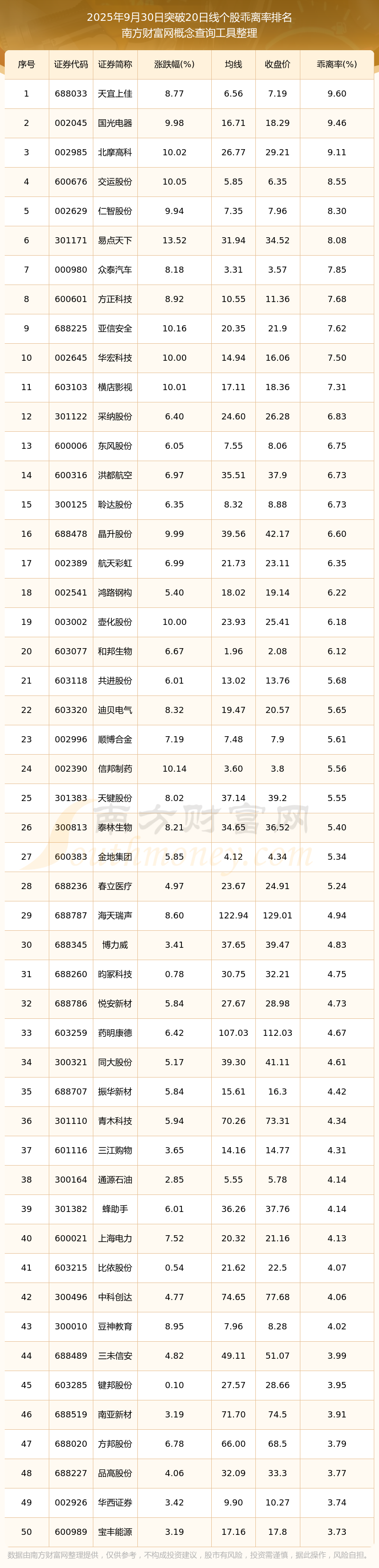 2025年9月30日突破20日線個(gè)股乖離率排名
