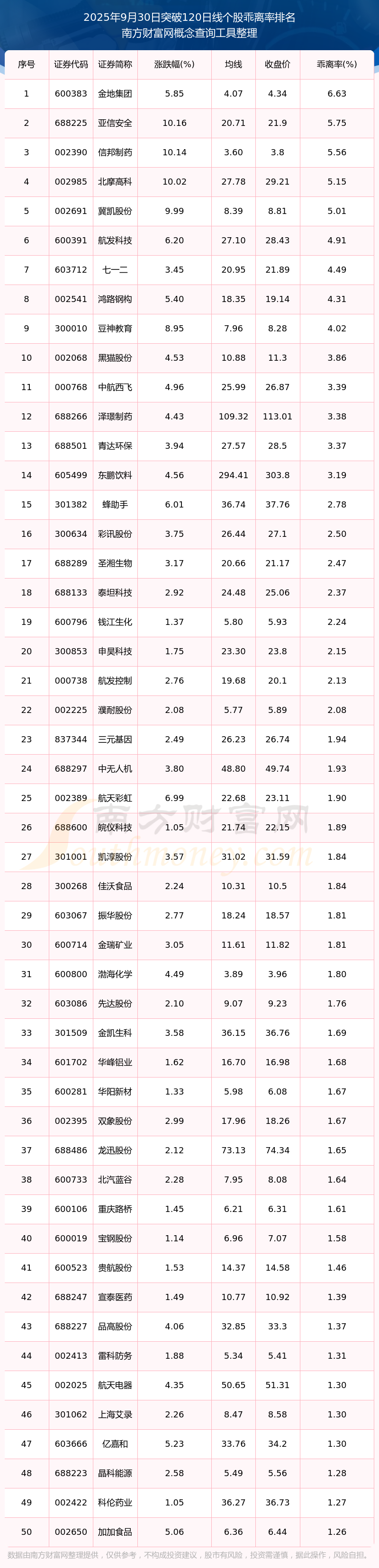 根據(jù)南方財富網(wǎng)概念查詢工具數(shù)據(jù)統(tǒng)計,截止2025年9月30日收盤,共有119只個股收盤價向上突破了半年線,其中乖離率較大的個股有金地集團、亞信安全、信邦制藥、北摩高科、冀凱股份等,乖離率分別為6.63%、5.75%、5.56%、5.15%、5.01%。