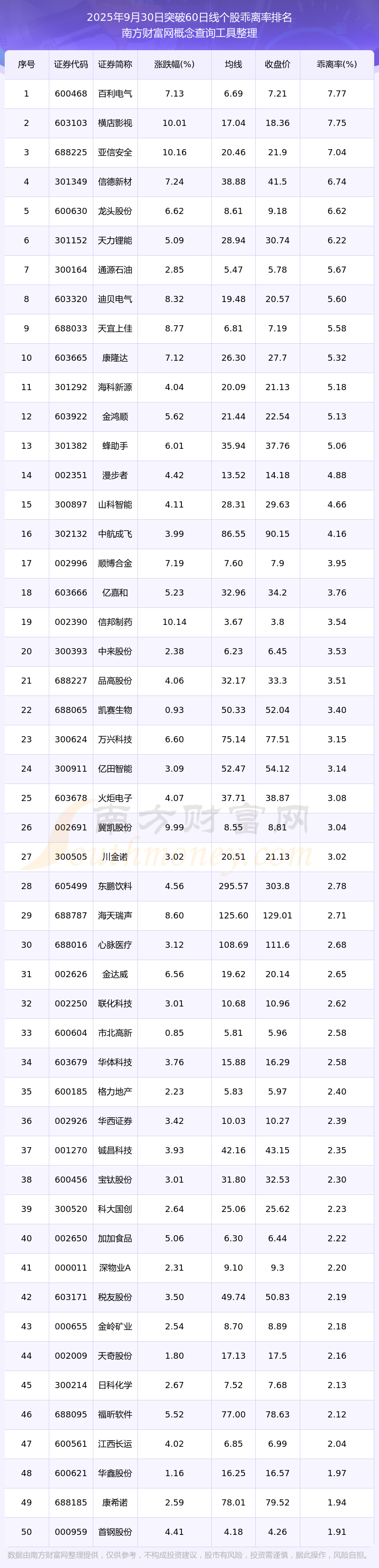 2025年9月30日突破60日線個(gè)股乖離率排名