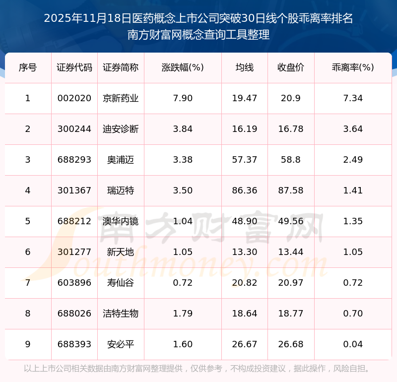 2025年11月18日醫(yī)藥概念上市公司突破30日線個股乖離率排名