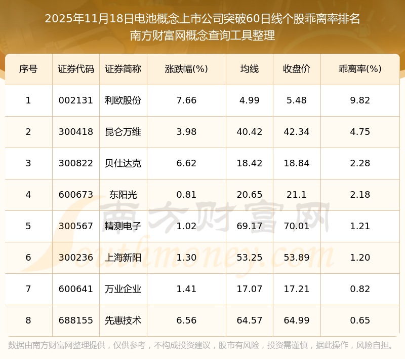 根據(jù)南方財富網(wǎng)概念查詢工具數(shù)據(jù)統(tǒng)計,截止2025年11月18日收盤,電池概念上市公司共有8只個股收盤價向上突破了60日線。其中乖離率較大的個股有利歐股份、昆侖萬維、貝仕達克等,乖離率分別為9.82%、4.75%、2.28%。