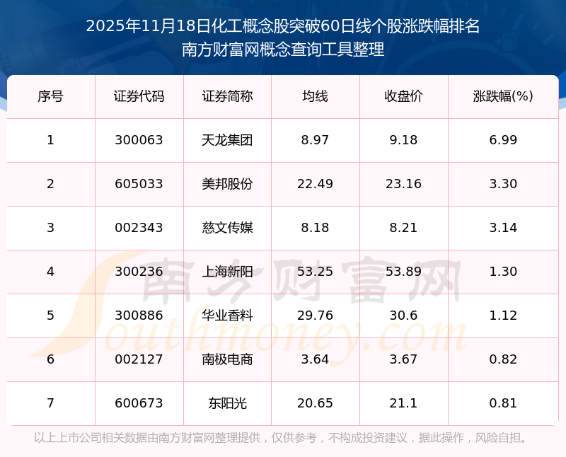 根據(jù)南方財(cái)富網(wǎng)概念查詢(xún)工具數(shù)據(jù)統(tǒng)計(jì),截止2025年11月18日收盤(pán),化工概念股共有7只個(gè)股收盤(pán)價(jià)向上突破了60日線。其中漲幅較大的個(gè)股有天龍集團(tuán)、美邦股份、慈文傳媒等,漲幅分別為6.99%、3.30%、3.14%。