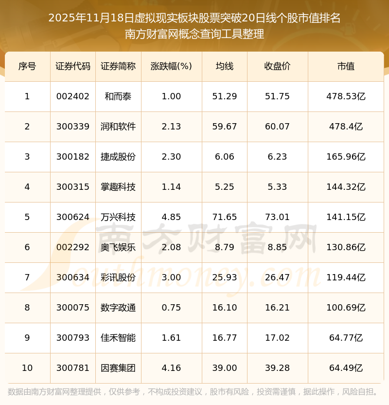 2025年11月18日虛擬現(xiàn)實(shí)板塊股票突破20日線個(gè)股市值排名