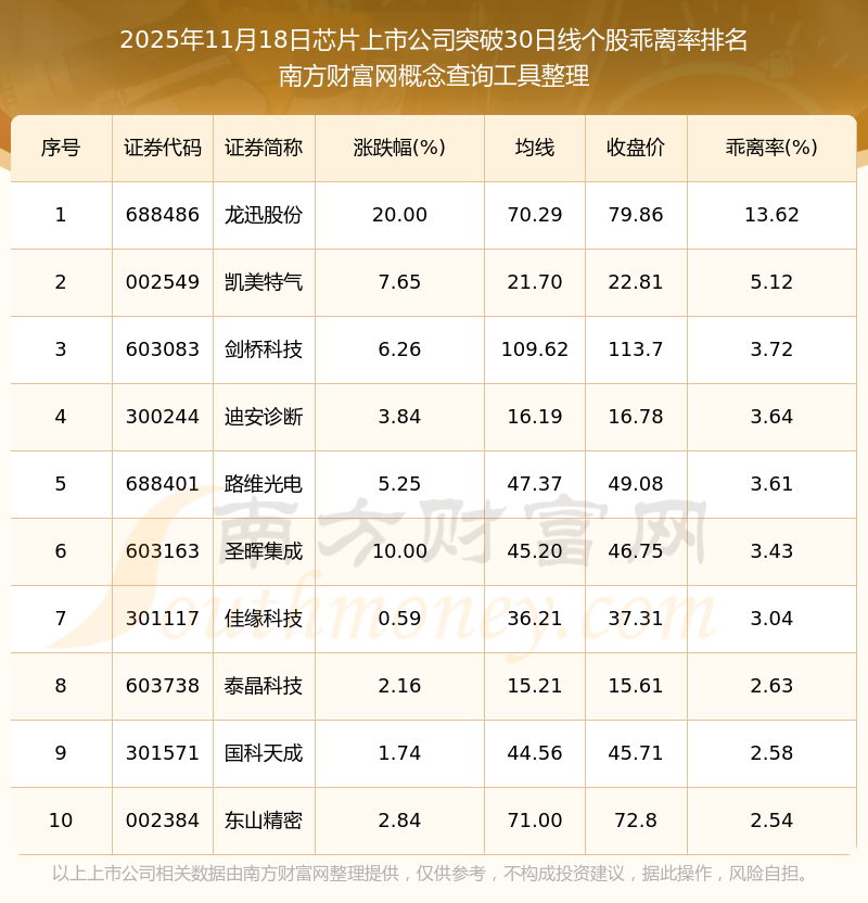 2025年11月18日芯片上市公司突破30日線個股乖離率排名