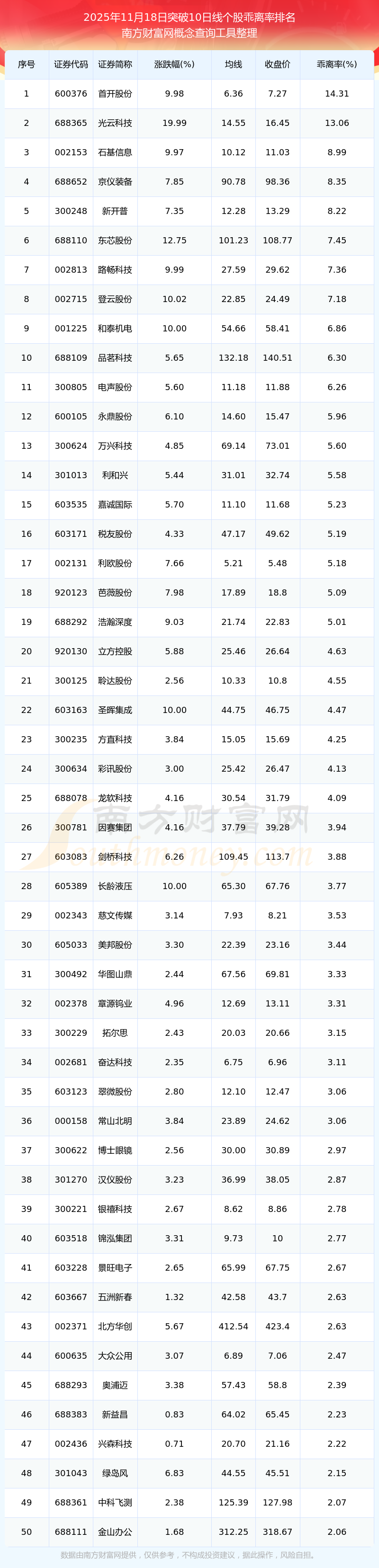 根據(jù)南方財富網(wǎng)概念查詢工具數(shù)據(jù)統(tǒng)計,截止2025年11月18日收盤,共有122只個股收盤價向上突破了10日線,其中乖離率較大的個股有首開股份、光云科技、石基信息、京儀裝備、新開普等,乖離率分別為14.31%、13.06%、8.99%、8.35%、8.22%。 2025年11月18日突破10