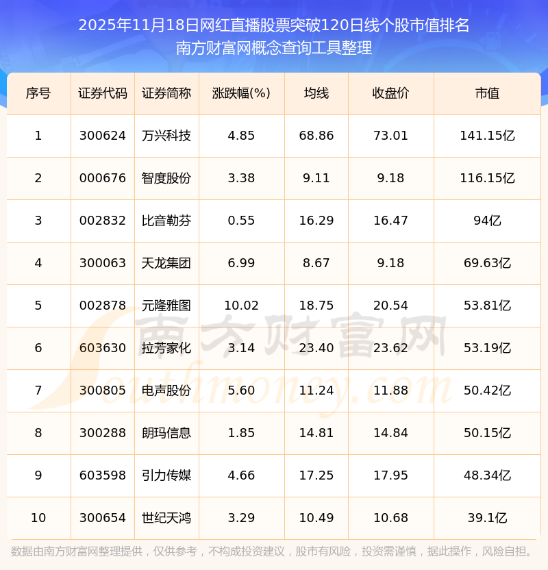 2025年11月18日網(wǎng)紅直播股票突破120日線個股市值排名