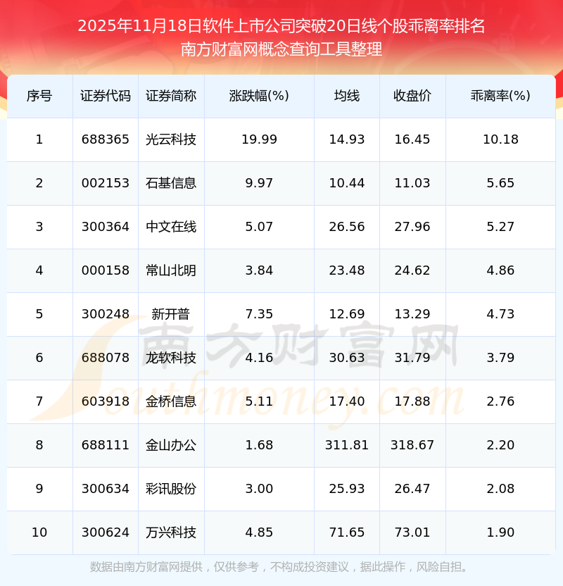 2025年11月18日軟件上市公司突破20日線個(gè)股乖離率排名
