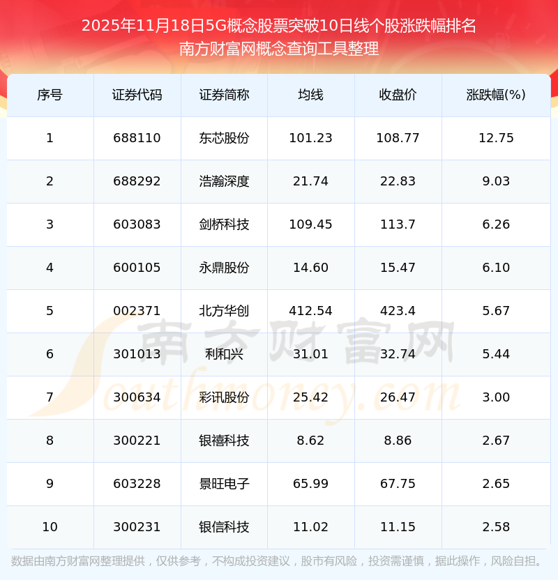 2025年11月18日5G概念股票突破10日線個(gè)股漲跌幅排名