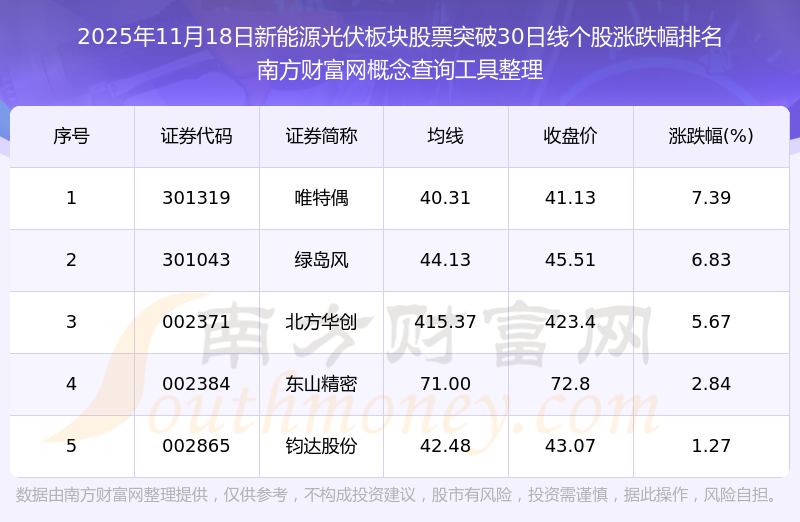 根據(jù)南方財富網(wǎng)概念查詢工具數(shù)據(jù)統(tǒng)計,截止2025年11月18日收盤,新能源光伏板塊股票共有5只個股收盤價向上突破了30日線。其中漲幅較大的個股有唯特偶、綠島風(fēng)、北方華創(chuàng)等,漲幅分別為7.39%、6.83%、5.67%。