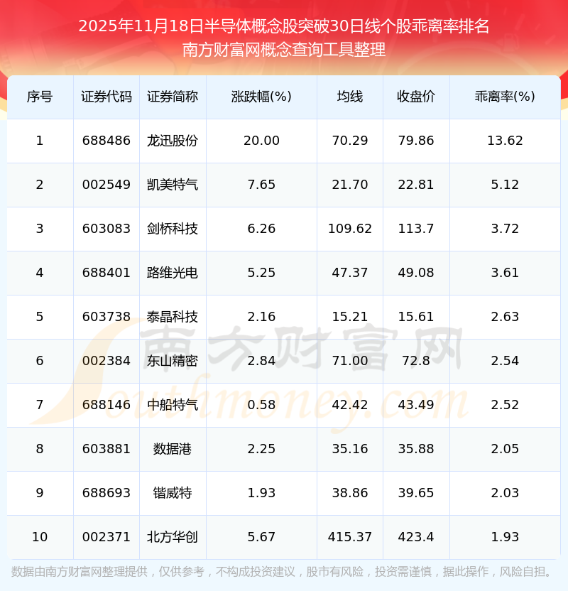 2025年11月18日半導(dǎo)體概念股突破30日線個(gè)股乖離率排名