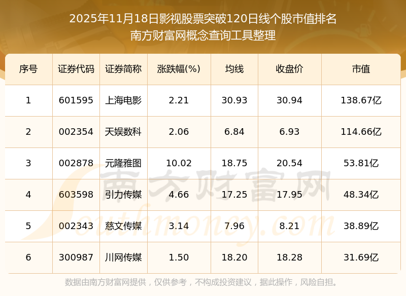根據(jù)南方財富網(wǎng)概念查詢工具數(shù)據(jù)統(tǒng)計,截止2025年11月18日收盤,影視股票共有6只個股收盤價向上突破了120日線。其中市值較大的個股有上海電影、天娛數(shù)科、元隆雅圖等,市值分別為138.67億、114.66億、53.81億。