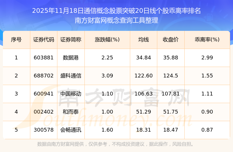 根據(jù)南方財(cái)富網(wǎng)概念查詢工具數(shù)據(jù)統(tǒng)計(jì),截止2025年11月18日收盤,通信概念股票共有5只個(gè)股收盤價(jià)向上突破了20日線。其中乖離率較大的個(gè)股有數(shù)據(jù)港、盛科通信、中國(guó)移動(dòng)等,乖離率分別為2.99%、1.55%、1.11%。