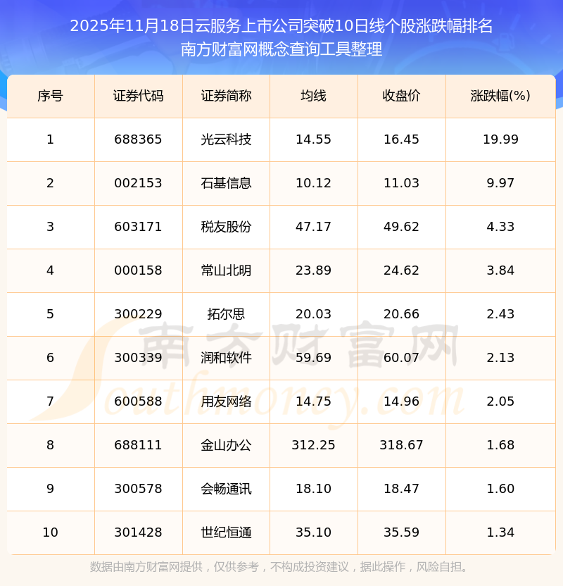 2025年11月18日云服務(wù)上市公司突破10日線個股漲跌幅排名