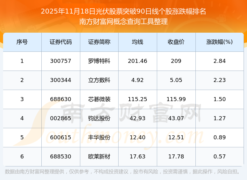 根據(jù)南方財(cái)富網(wǎng)概念查詢工具數(shù)據(jù)統(tǒng)計(jì),截止2025年11月18日收盤,光伏股票共有6只個股收盤價(jià)向上突破了90日線。其中漲幅較大的個股有羅博特科、立方數(shù)科、芯碁微裝等,漲幅分別為2.84%、2.23%、1.50%。