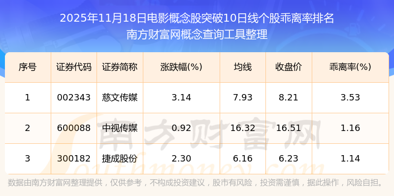 根據(jù)南方財(cái)富網(wǎng)概念查詢工具數(shù)據(jù)統(tǒng)計(jì),截止2025年11月18日收盤,電影概念股共有3只個(gè)股收盤價(jià)向上突破了10日線。其中乖離率較大的個(gè)股有慈文傳媒、中視傳媒、捷成股份等,乖離率分別為3.53%、1.16%、1.14%。
