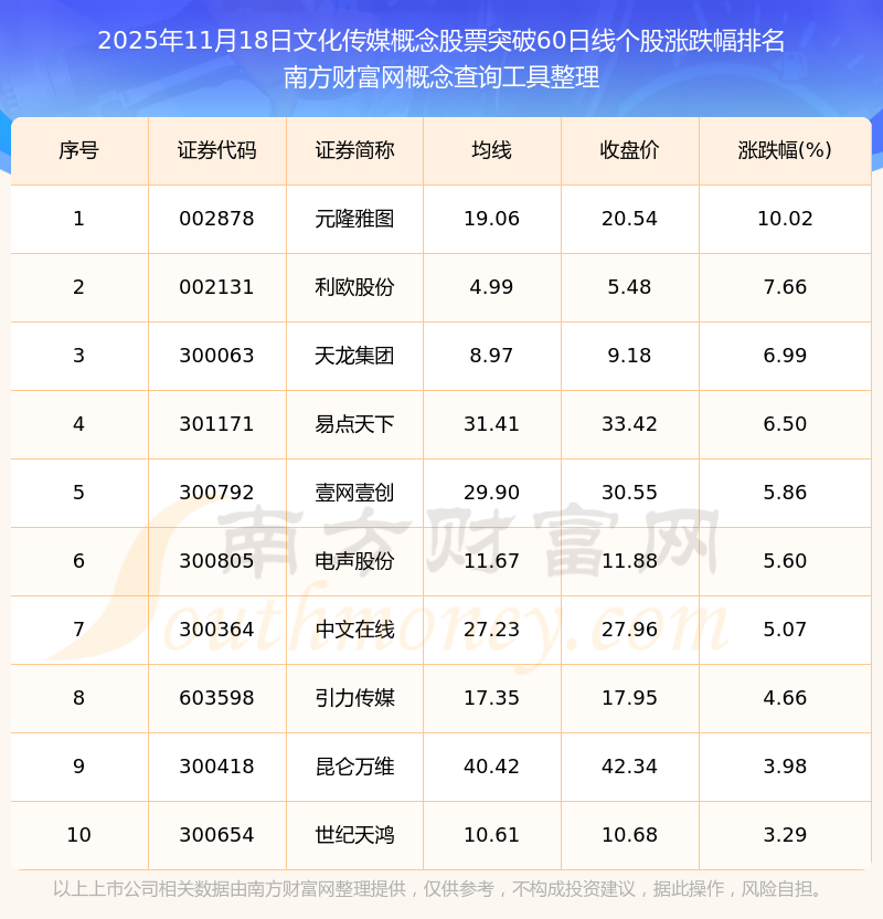 2025年11月18日文化傳媒概念股票突破60日線個股漲跌幅排名