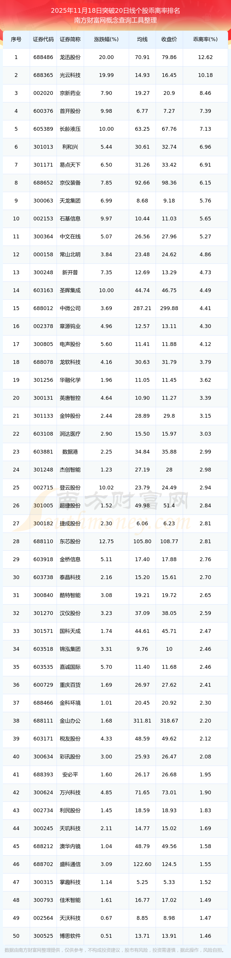 根據(jù)南方財富網(wǎng)概念查詢工具數(shù)據(jù)統(tǒng)計,截止2025年11月18日收盤,共有82只個股收盤價向上突破了20日線,其中乖離率較大的個股有龍迅股份、光云科技、京新藥業(yè)、首開股份、長齡液壓等,乖離率分別為12.62%、10.18%、8.46%、7.39%、7.13%。