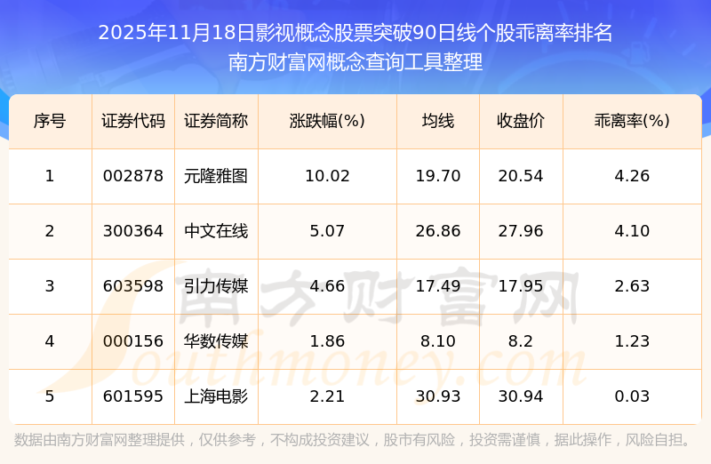 根據(jù)南方財(cái)富網(wǎng)概念查詢工具數(shù)據(jù)統(tǒng)計(jì),截止2025年11月18日收盤,影視概念股票共有5只個股收盤價向上突破了90日線。其中乖離率較大的個股有元隆雅圖、中文在線、引力傳媒等,乖離率分別為4.26%、4.10%、2.63%。