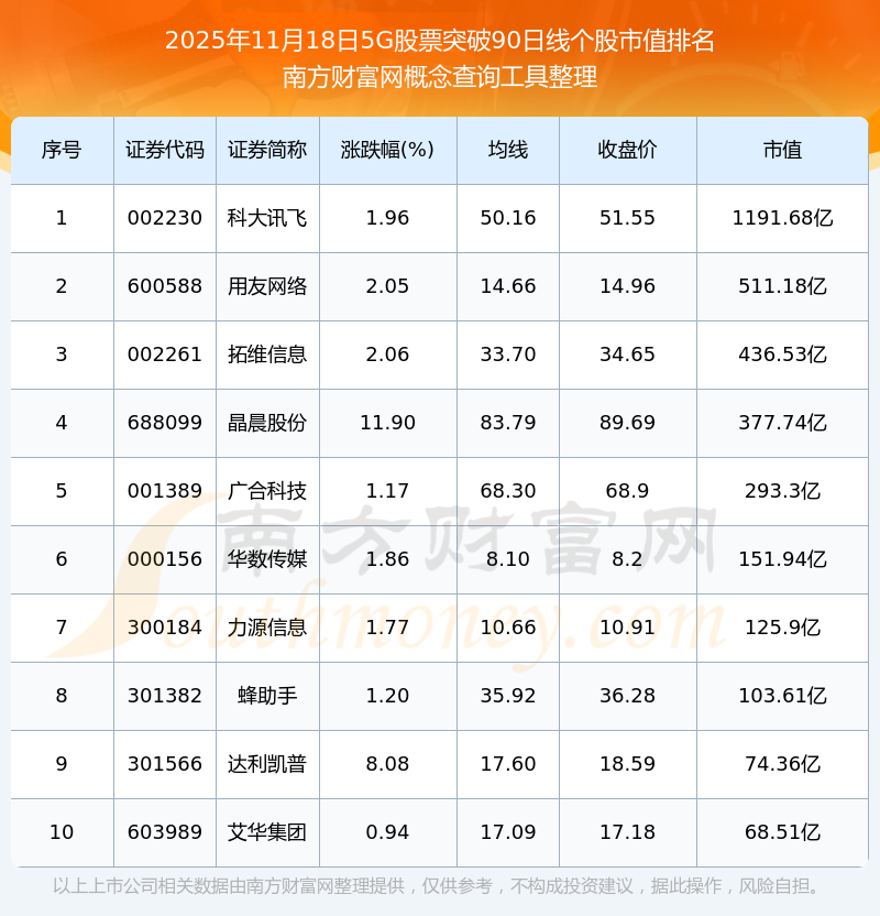 根據(jù)南方財富網(wǎng)概念查詢工具數(shù)據(jù)統(tǒng)計,截止2025年11月18日收盤,5G股票共有16只個股收盤價向上突破了90日線。其中市值較大的個股有科大訊飛、用友網(wǎng)絡(luò)、拓維信息等,市值分別為1191.68億、511.18億、436.53億。