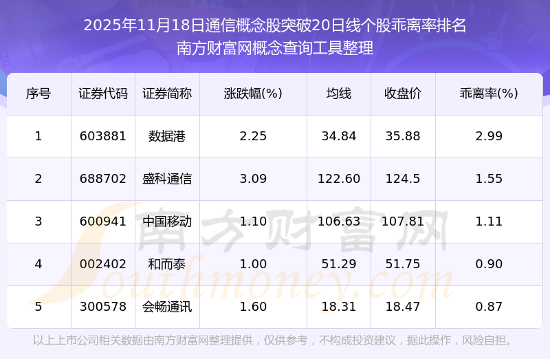 根據(jù)南方財(cái)富網(wǎng)概念查詢工具數(shù)據(jù)統(tǒng)計(jì),截止2025年11月18日收盤,通信概念股共有5只個(gè)股收盤價(jià)向上突破了20日線。其中乖離率較大的個(gè)股有數(shù)據(jù)港、盛科通信、中國移動(dòng)等,乖離率分別為2.99%、1.55%、1.11%。
