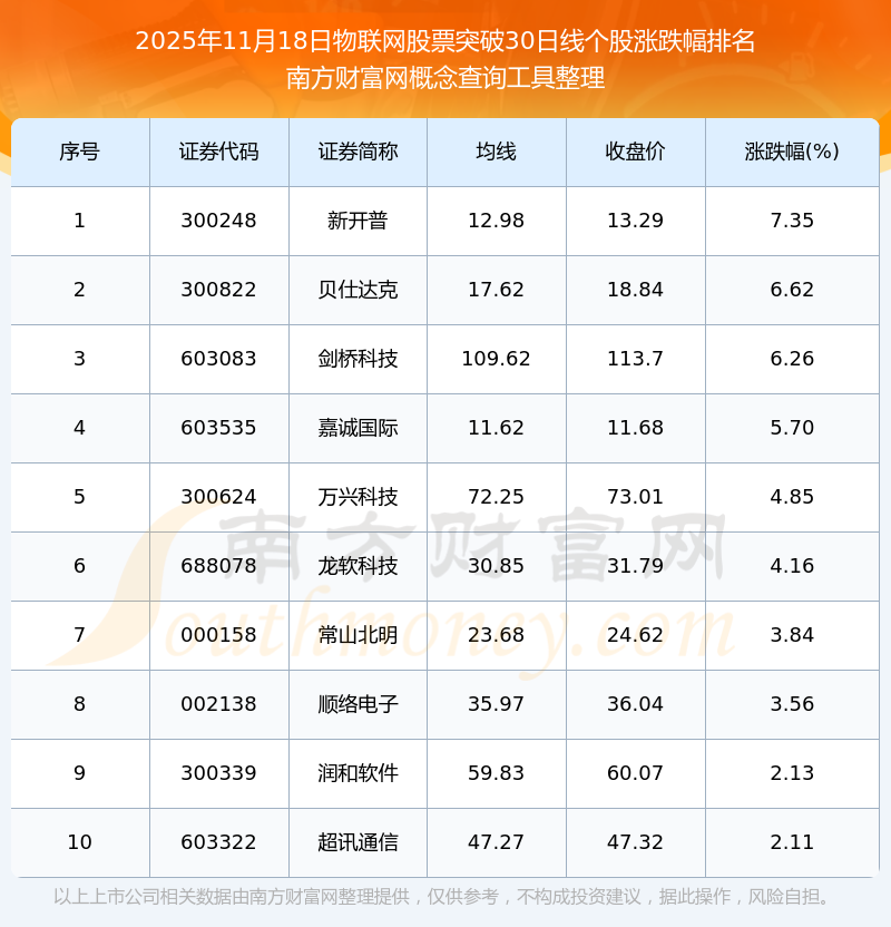 2025年11月18日物聯(lián)網(wǎng)股票突破30日線個(gè)股漲跌幅排名