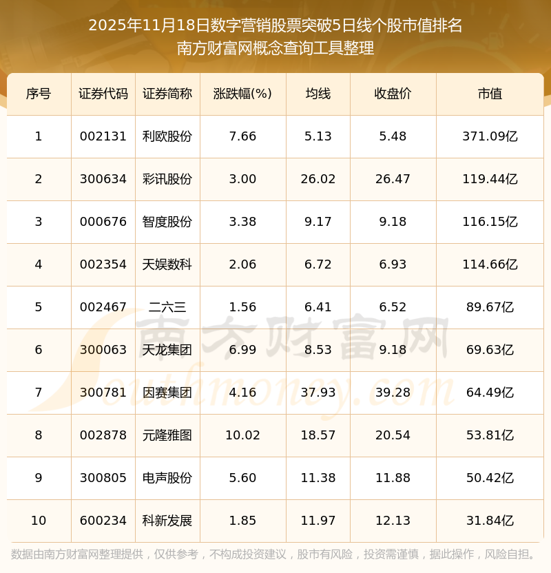 2025年11月18日數(shù)字營銷股票突破5日線個股市值排名