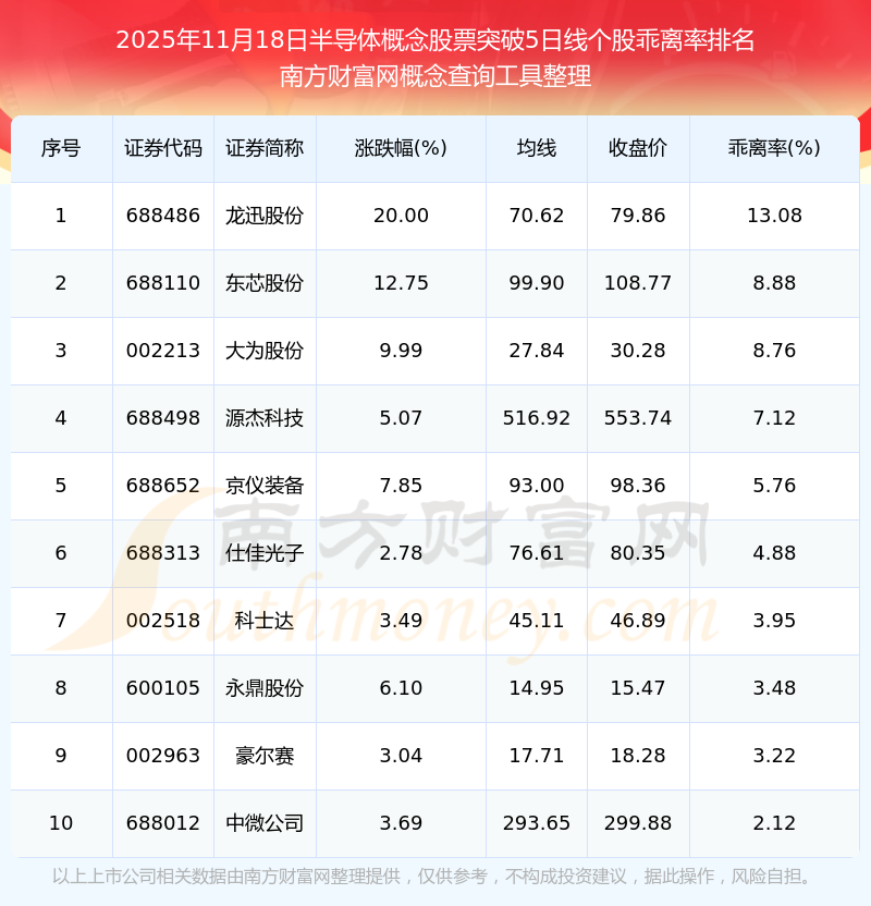 2025年11月18日半導(dǎo)體概念股票突破5日線個股乖離率排名