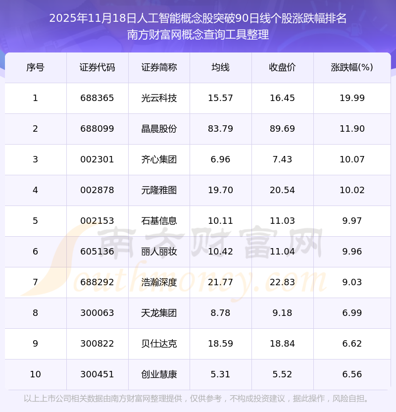 2025年11月18日人工智能概念股突破90日線個(gè)股漲跌幅排名