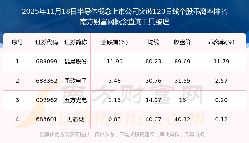2025年11月18日半導(dǎo)體概念上市公司突破120日線個(gè)股乖離率排名