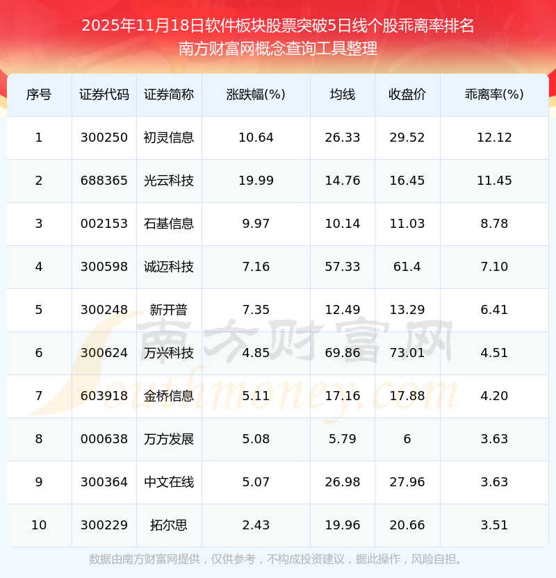 2025年11月18日軟件板塊股票突破5日線(xiàn)個(gè)股乖離率排名