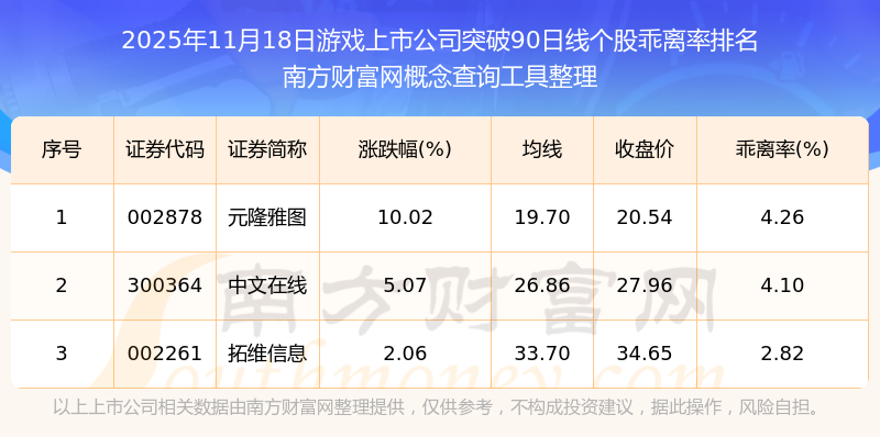 根據(jù)南方財富網(wǎng)概念查詢工具數(shù)據(jù)統(tǒng)計,截止2025年11月18日收盤,游戲上市公司共有3只個股收盤價向上突破了90日線。其中乖離率較大的個股有元隆雅圖、中文在線、拓維信息等,乖離率分別為4.26%、4.10%、2.82%。