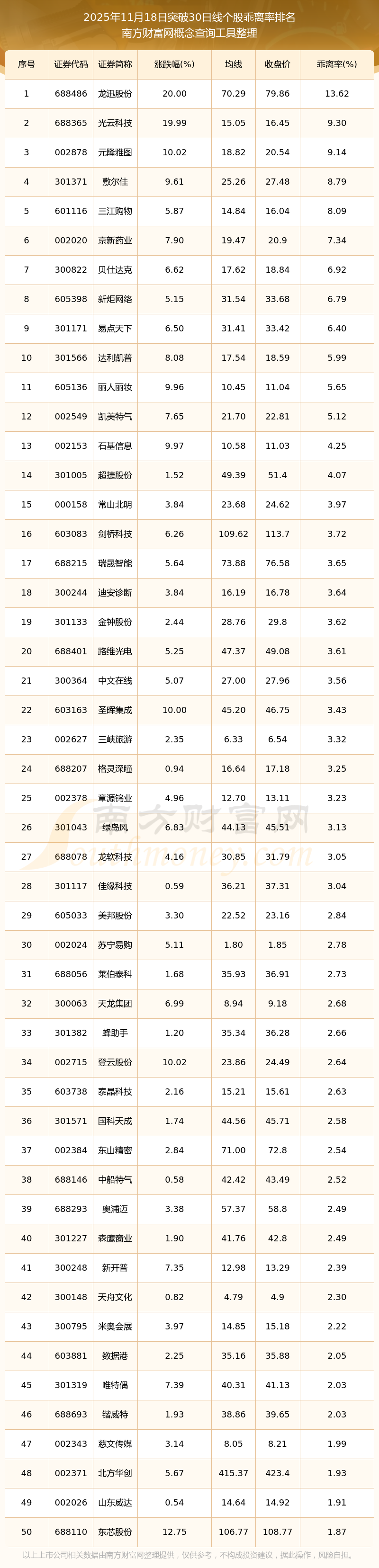 2025年11月18日突破30日線個(gè)股乖離率排名